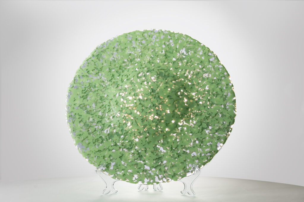 Estetyka FENOMA jest nierozerwalnie spleciona z postindustrialnym pochodzeniem surowca. Wybór szkła dyktuje konkretny moment w strumieniu odpadów z wielkoskalowej produkcji; to te narzucone „recyklingowe ramy” wymuszają liczne próby technologiczne. Techniki fusingu i slumpingu pozwalają na utrwalenie w masie oddziaływania grawitacji i termiki – to one generują wielowarstwową, niemal kosmiczną strukturę wizualną. Oszczędna geometria projektów stanowi tu niezbędną przeciwwagę dla wysokiej intensywności barwnej i strukturalnej tworzywa